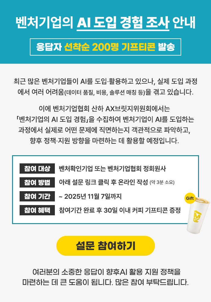 [설문 참여 안내] 벤처기업의 AI 도입 경험 조사 (선착순 200명 커피 기프티콘 증정)
